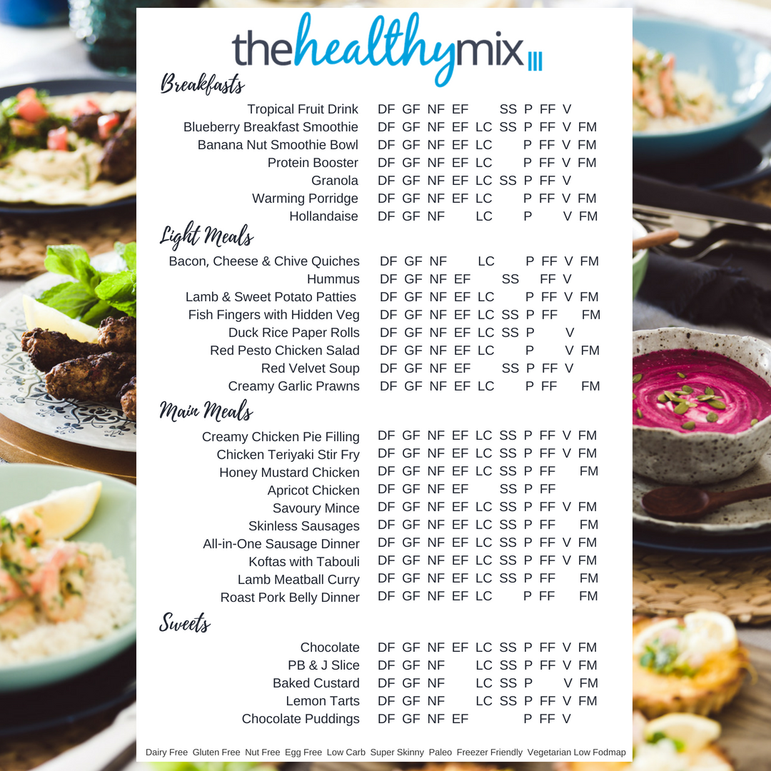 - All recipes are (or have suggestions for) gluten free, grain free, dairy free, soy free, low carb, low calorie, low fodmap, vegetarian and refined sugar free, where possible.